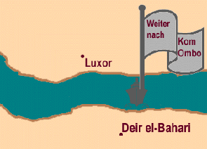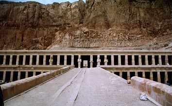 Aus einer Reihe breiter Terassen bestand der Tempel von Deir el-Bahari. Dieses einzigartige Beispiel ägyptischer Baukunst ist ein Werk des Senmut, der Baumeister und zugleich erster Minister der Königin Hatschepsut war. Nach dem Tod ihres Vaters Thutmosis I. heiratete Hatschepsut ihren Halbbruder Thutmosis II. Als dieser früh starb, war der einzige Nachkomme, Thutmosis II., noch ein Kind. Für ihn regierte Hatschepsut und behauptete sich 22 Jahre lang auf dem Thron. Ihren Herrschaftsanspruch ließ sie auf zahlreichen Reliefs festschreiben. Als Thutmosis III. nach Hatschepsuts Tod an die Macht kam, bestand eine seiner ersten Amtshandlungen offenbar darin, an Denkmälern und Tempeln Hatschepsuts Namen tilgen und durch seinen eigenen ersetzen zu lassen. Noch immer liegt die Vermutung nahe, daß Thutmosis III. seine Stiefmutter ermordet haben soll, ihre Mumie wurde bis heute nicht gefunden.