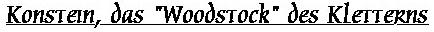 Wenn von Konstein als dem "Woodstock" des Kletterns die Rede ist, dann ist damit nicht gemeint, daß dort etwa lauter Hippies in Flower-Power-Manie den Berg hochkraxeln. Nein: Denn berühmt wurde der kleine Ort im Altmühltal, der als Klettergebiet bereits zu Beginn unseres Jahrhunderts entdeckt worden ist, durch ein sportliches Mega-Event im Mai 1981, dem Ersten Internationalen Sportklettern, dem später der Name "Woodstock" des Kletterns gegeben worden ist.
