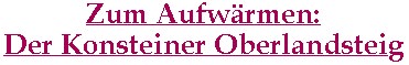 Der gut vier Kilometer lange Oberlandsteig ist ideal für alle, die den Konsteiner Klettergarten ohne größere Mühen erst einmal "ablaufen" und sich selbst "warmlaufen" wollen. Dieser relativ leichte Klettersteig durchzieht nämlich das ganze Klettergebiet, also von der Hinteren Konsteiner Wand bis hin zur Lochwand. Der Steig spaltet sich in zwei Wege unterschiedlicher Schwierigkeit auf, die größtenteils parallel zueinander verlaufen.