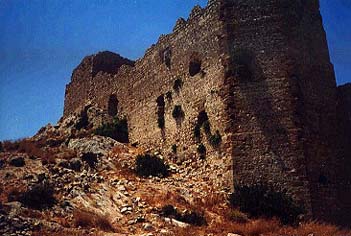 | Die Mauern der 1472 errichteten Burg sind teilweise noch bis zu den Zinnen erhalten. Am beeindruckendsten ist jedoch der weite Blick auf das Meer bis zu den Inseln Alimnía und Chalki. Autofahrer sollten sich auf den Serpentinen hoch zur Burgruine schon ein paar Drachmen bereithalten. Es könnte sein, daß eine alte Frau das Auto aufhält und ihnen eine Wassermelone oder eine Gurke verkaufen möchte. Und zwar als Gegenleistung dafür, daß sie das Kastell für die Touristen sauberhält.